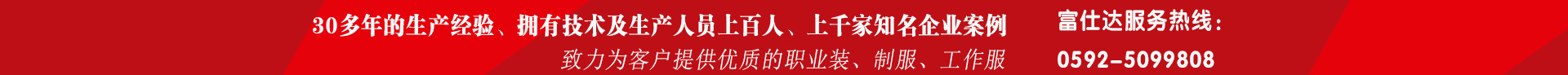 廈門富仕達(dá)服飾有限公司為專業(yè)工作服廠服職業(yè)裝制服32年!公司集設(shè)計(jì),生產(chǎn)加工,售后為一體的專業(yè)職業(yè)裝公司,歡迎同業(yè)來(lái)料加工。電話:0592-5099808。富仕達(dá)職業(yè)裝已成為多家知名連鎖企業(yè),跨國(guó)公司及上市企業(yè)等專業(yè)服裝外包商。